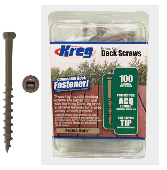 Pakke m/ 100 stk. høykvalitets ”protec-kote” terrassebord skruer som passer perfekt for bruk sammen med Kreg Deck Jig eller som en generell feste skrue for andre prosjekter. Protec-kote har tre anti-korrosjon lag kjemisk kombineres for å gi god beskyttelse mot rust og korrosjon for bruk utendørs. Perfekt for ACQ behandlet trelast